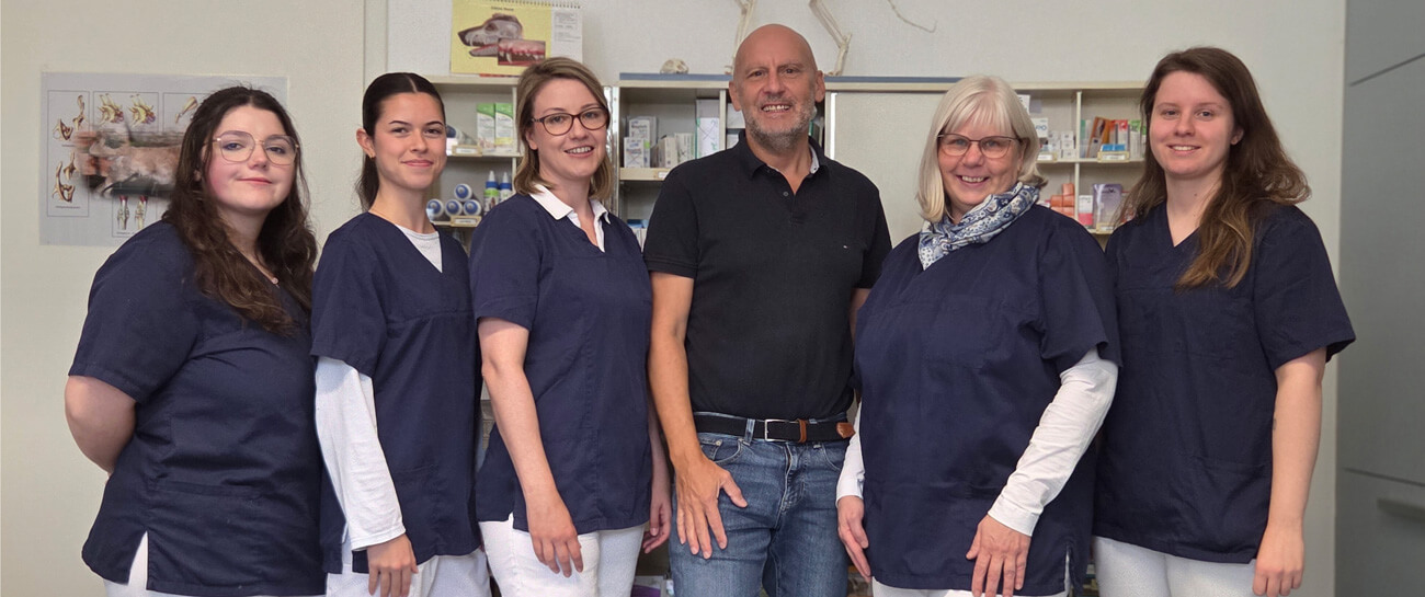 Auszubildende TFA Alina Buchmeier, Auszubildende TFA Sophia Robl, Tierärztin Dr. Stefanie Weber, Tierarzt Dr. Steffen Hoffmann, Tierärztin Daniela Völger, TFA Alina Katschthaler (von links nach rechts)