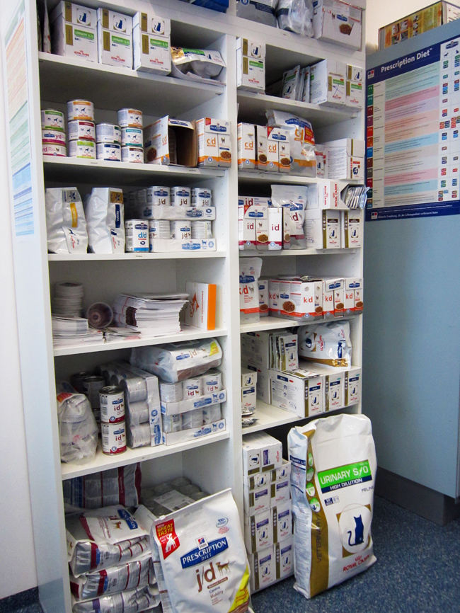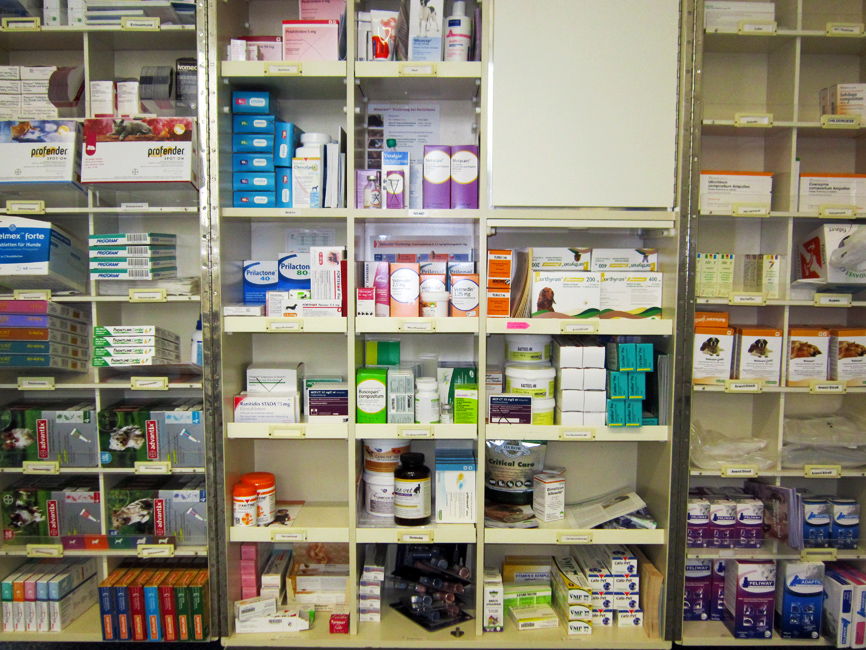 Meine Praxis verfügt über eine gut ausgestattete Hausapotheke mit krankheitsvorbeugenden und therapeutischen Präparaten, sowie speziellen Diätfuttermitteln.