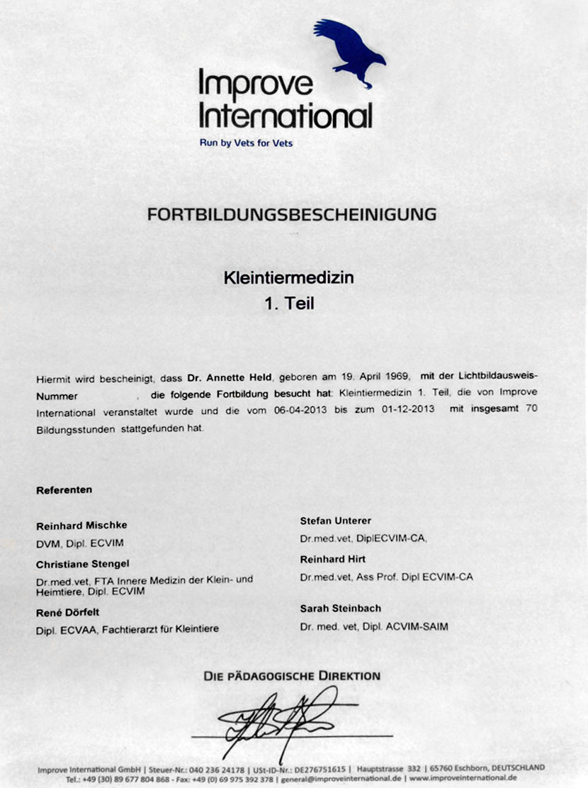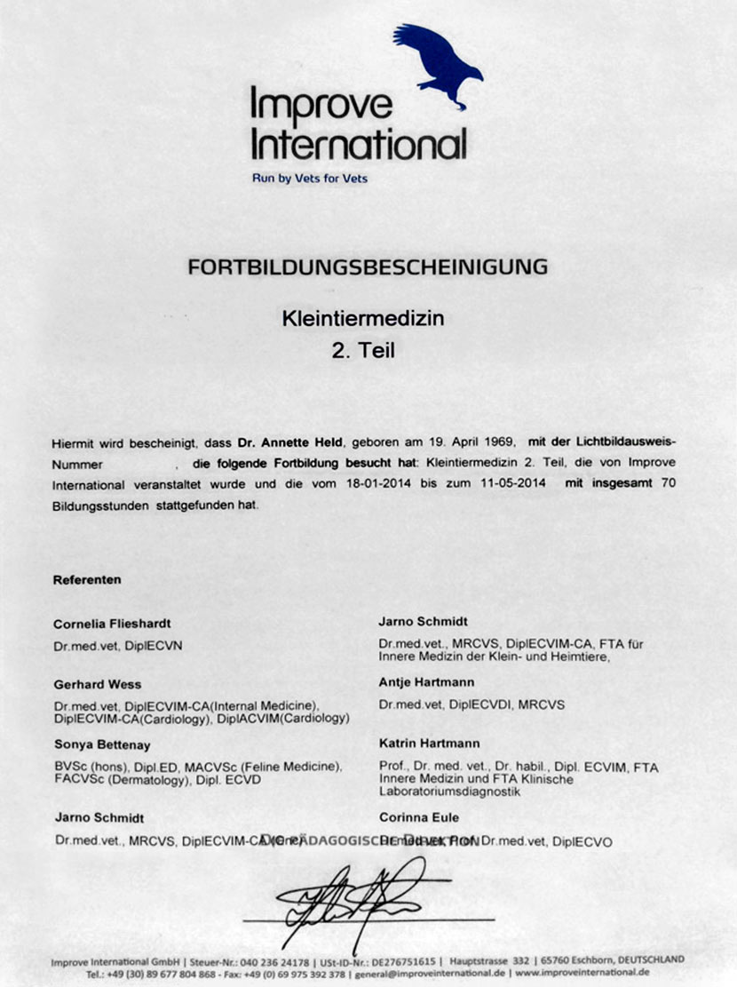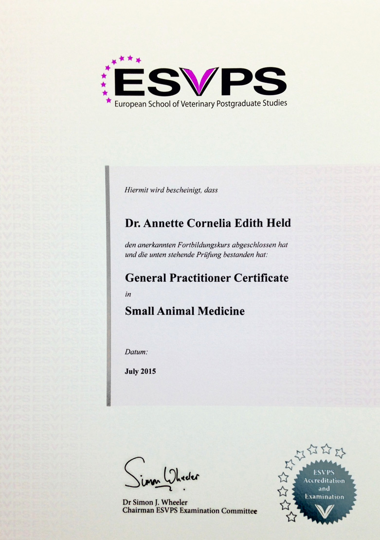Um ihre Kenntnisse in der inneren Kleintiermedizin zu vertiefen und zu erweitern, hat Frau Dr. Held, neben ihrer tierärztlichen Tätigkeit in meiner Praxis, an einer 1 ½-jährigen Fortbildungsreihe (Improve International) mit insgesamt 140 Fortbildungsstunden teilgenommen. Hier vermitteln Top-Spezialisten aus Europa und den USA die neuesten Erkenntnisse in den Teilbereichen der inneren Medizin und damit den höchstmöglichen Ausbildungsstand auf ihrem jeweiligen Fachgebiet. Im November 2014 hat Frau Dr. Held die Abschlussprüfung zum General Practitioner Certificate in Small Animal Medicine vor der European School of Postgraduate Studies (ESVPS) erfolgreich bestanden.
