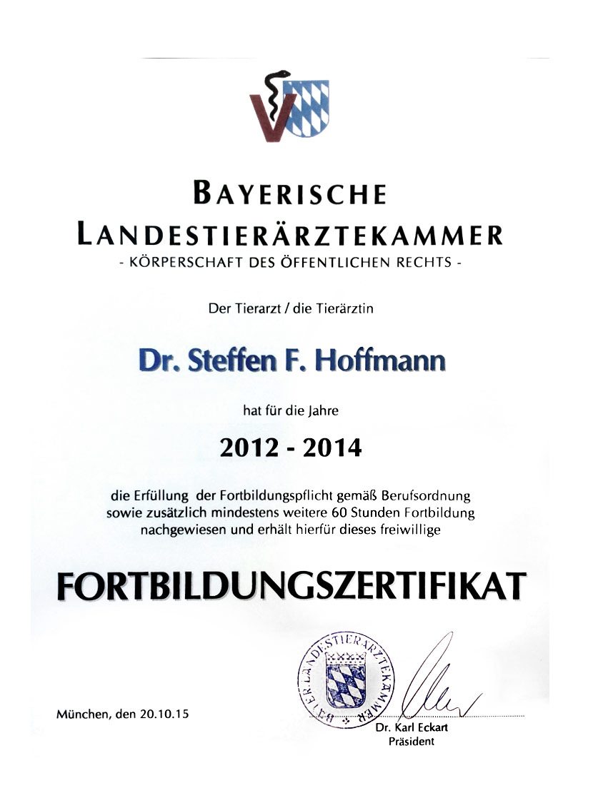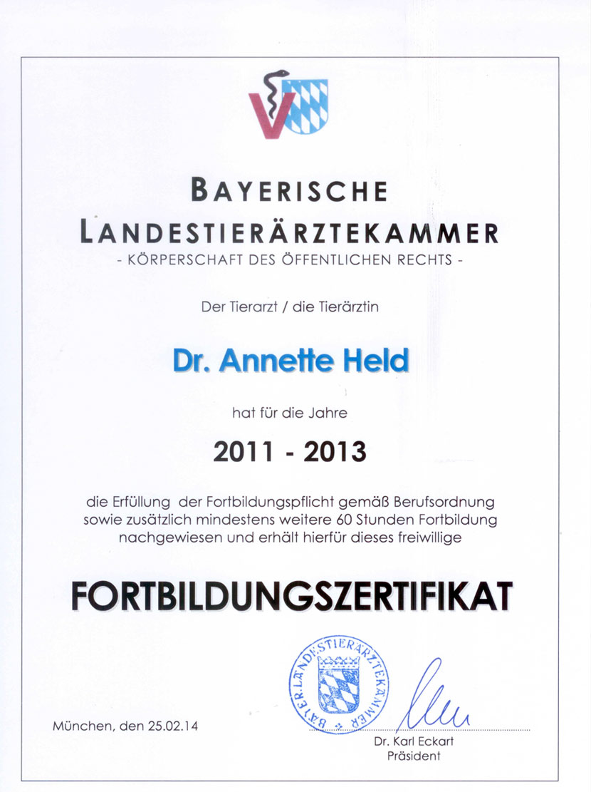 Die Berufsordnung für Tierärzte in Bayern sieht eine Fortbildungspflicht für praktizierende Tierärzte von mindestens 20 Stunden pro Jahr vor. Besonders engagierte Tierärzte, die mindestens 40 Fortbildungsstunden pro Jahr nachweisen können, werden mit dem freiwilligen Fortbildungszertifikat der Bayerischen Landestierärztekammer ausgezeichnet. Frau Dr. Held und Herr Dr. Hoffmann haben in den letzten Jahren diese Kriterien in dem Bestreben, sich ständig zu verbessern und sich neues Fachwissen anzueignen, erfüllt.