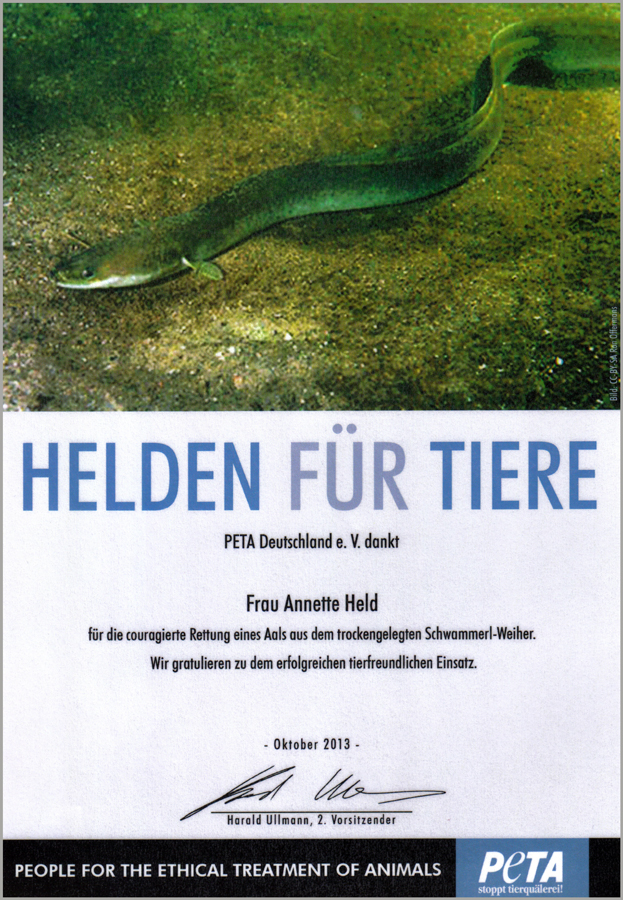 „Wir sind begeistert über den heldenhaften Einsatz von Frau Held“, sagt Judith Pein im Namen von PETA. „Durch ihr tierfreundliches Engagement konnte das Leben des Aals gerettet werden. Er wäre sonst qualvoll erstickt.“